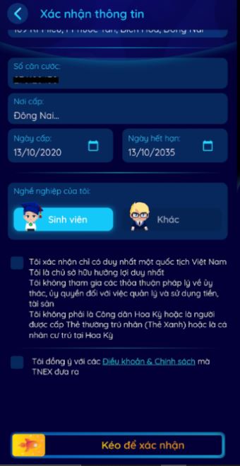 Bước 7: Tiếp tục làm theo hướng dẫn trên App, cung cấp các giấy tờ và thông tin cá nhân liên quan để mở tài khoản. Mở tài khoản Tnex mới xong, tiền thưởng sẽ được cộng trực tiếp vào tài khoản giao dịch của bạn.
