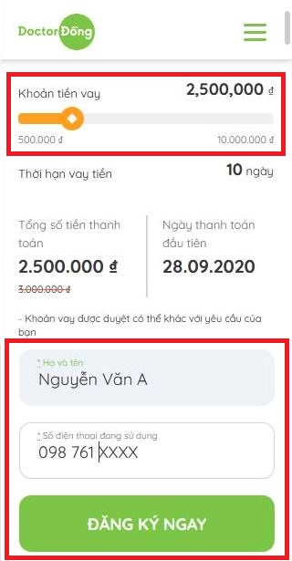 Bước 1: Đầu tiên bạn cần nhập Số tiền cần vay và kì hạn vay trên ứng dụng. Nhấn nút Đăng ký để gửi khoản vay cho Doctor Đồng bắt đầu đăng ký tài khoản.