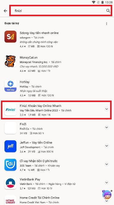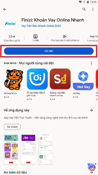 Bước 3: Ở trang kết quả tìm kiếm, lựa chọn App Finizi và nhấn vào nút Cài Đặt. App sẽ được tải về và cài đặt tự động trong vòng khoảng 1 phút.
