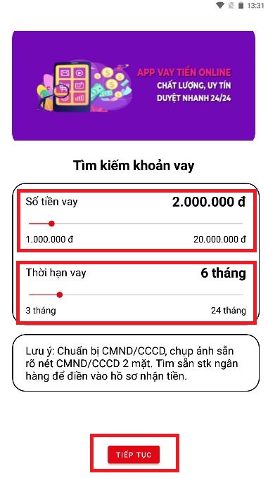 Bước 2: Bắt đầu làm hồ sơ vay, lựa chọn khoản vay theo nhu cầu với Số tiền và Kỳ hạn phù hợp.
