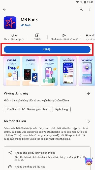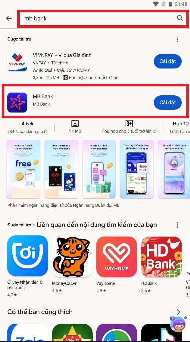 Bước 3: Ở trang kết quả tìm kiếm, chọn vào App MB Bank và nhấn nút Cài Đặt.