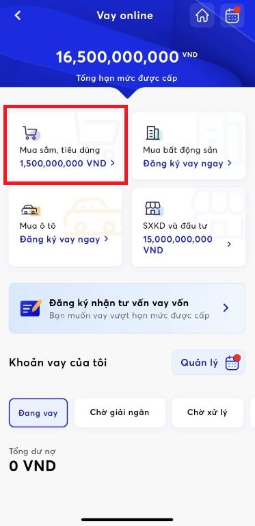 Bước 2: Lựa chọn hình thức Vay tiêu dùng, nhập OTP được gửi về số điện thoại để xác nhận đăng ký vay.