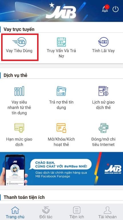 Bước 1: Mở App MB Bank vừa được tải về. Ở giao diện bắt đầu, nhấn nút Vay Online.