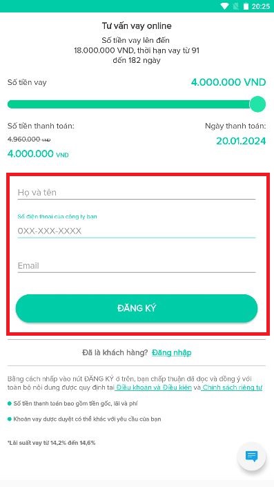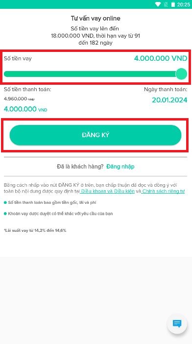 Bước 1: Mở App Oncredit lên, bạn sẽ thấy mục thông tin đăng ký khoản vay. Lựa chọn số tiền bằng thanh trượt và kì hạn vay được cung cấp sẵn.